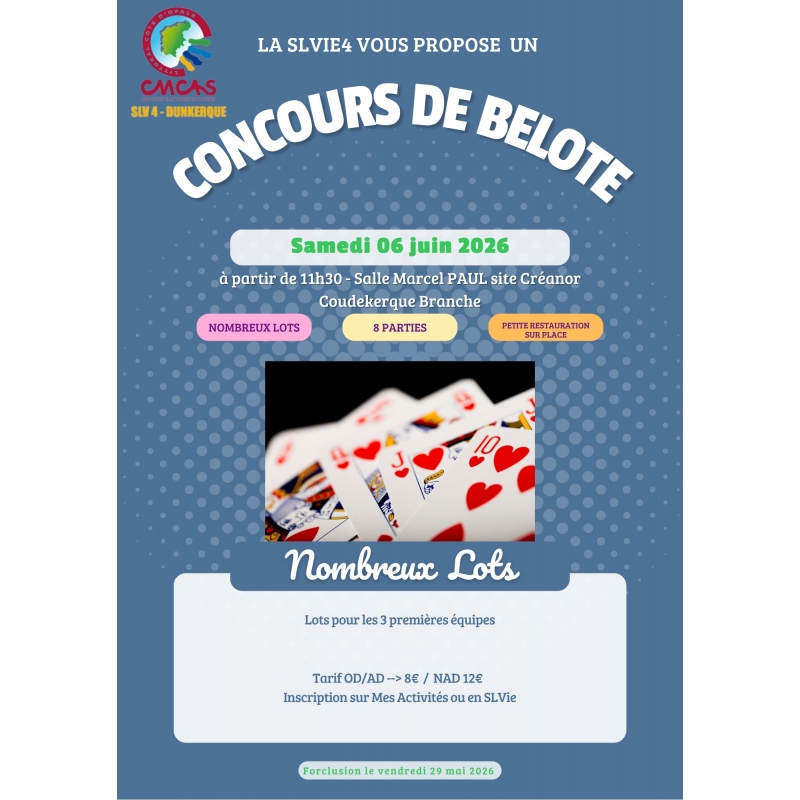 La SLV4 vous propose un concours de belote en équipe formée le samedi 6 juin2026 à partir de 11h30 salle Marcel Paul site CREANOR à Coudekerque Branche.
